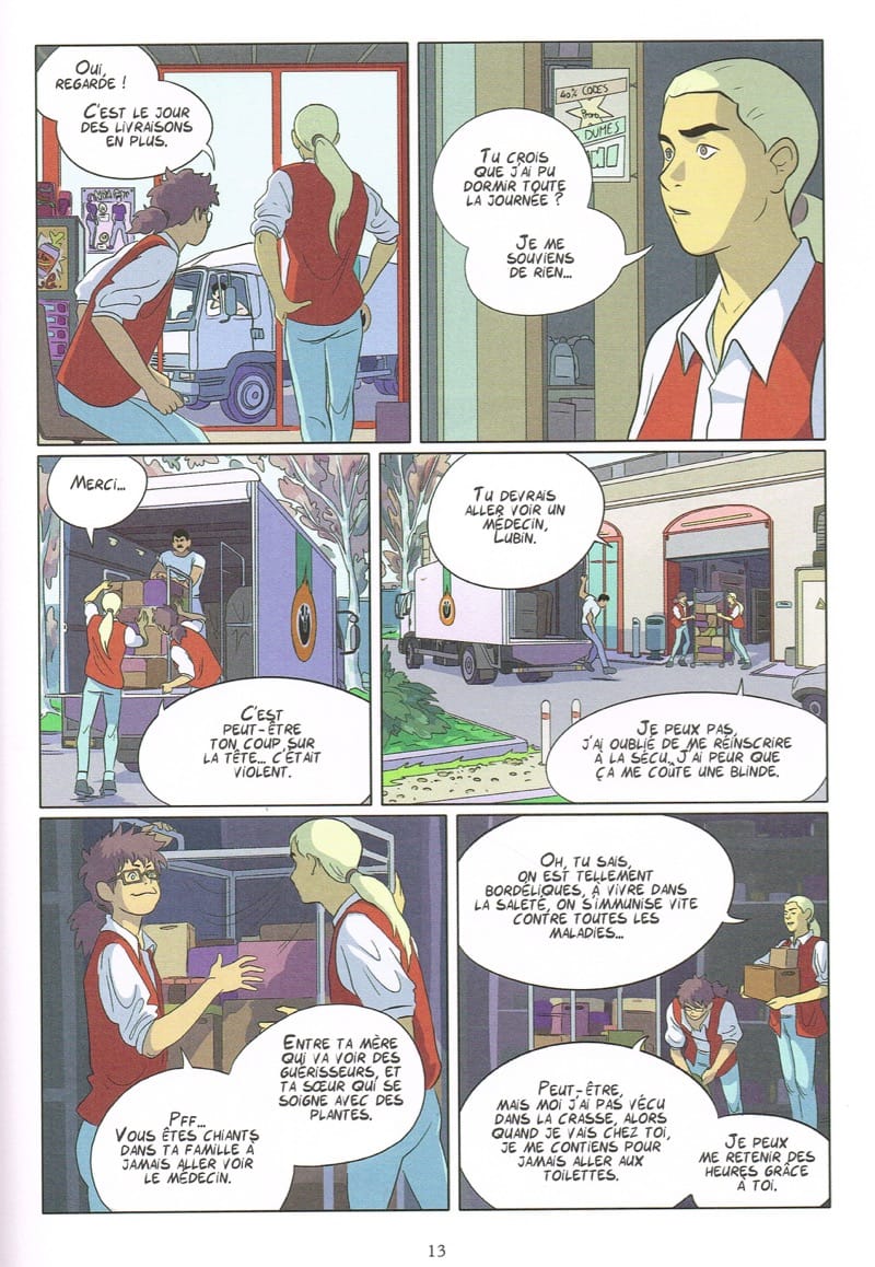 Dans Ces jours qui disparaissent, nous faisons la connaissance de Lubin Maréchal, un jeune homme d’une vingtaine d’années acrobate dans un cirque. Depuis qu’il a reçu un coup sur la tête suite à une chute, il se réveille chaque matin alors qu’un jour entier s’est écoulé entre temps. Je ne vous en dirai pas plus sur l’histoire, et j’ai volontairement raccourci le résumé, car je pense que la raison pour laquelle j’ai autant accroché à ce récit, c’est que je ne savais strictement rien avant de me lancer. Je vous conseille vivement de vous y plonger sans lire le résumé, car ce roman graphique perd de son intérêt lorsqu’on sait déjà ce qu’il s’y passe.
