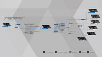 Dès la fin de la scène, vous aurez accès à l’arborescence de celle-ci. Vous pourrez ainsi visualiser l’ensemble de vos choix, mais également toutes les alternatives possibles. Le pourcentage mondial des joueurs (et de vos amis) ayant agi comme vous (ou non) est également consultable. À vous donc de remplir cet arbre de possibilités.